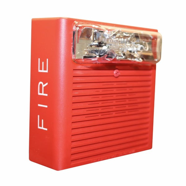 The Eaton Wheelock ASWP-2475C-FR is a weatherproof, ceiling-mounted horn strobe designed for reliable audible and visual signaling in outdoor and harsh indoor environments. Featuring a red housing with “FIRE” lettering and a clear lens, it is suitable for fire alarm systems requiring robust notification appliances.